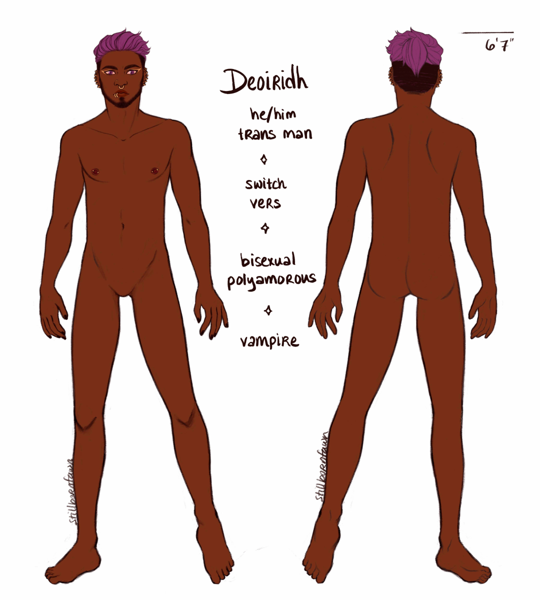 full name: deoiridh age: millenia pronouns: he/him ethnicity: mesopotamian? gender: trans man orientation: bi height: 6'7" / 201cm